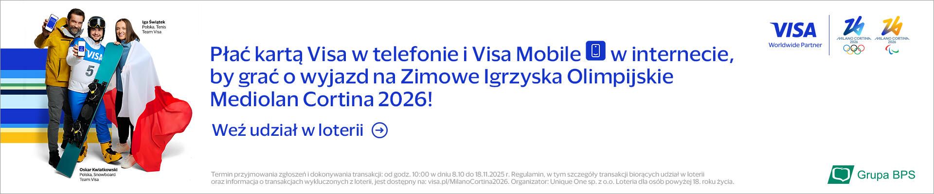 Szczegóły oraz pełny regulamin znajdziesz na stronie https://www.visa.pl/campaign/milanocortina2026/